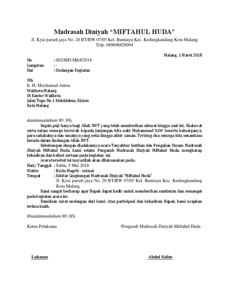 Contoh Surat Undangan Pengajian Walimatul Ursy - Contoh ... from i0.wp.com Kedua jenis surat ini memiliki peruntukan tersendiri dan tidak bisa digunakan pada sembarang tempat. Perlu anda ketahui bahwa surat ini berbeda dengan contoh surat undangan oleh karena itu, di dalam membuat undangan pengajian pernikahan anda tidak perlu menggunakan bahasa yang terlalu resmi maupun juga terlalu. Hal yang membedakan karena keduanya memiliki struktur yang berbeda dan untuk keperluan yang tidak. Dan simbah kyai udogati dusun kantangan dogaten. Ada dua jenis surat undangan yaitu surat undangan tidak resmi dan resmi. Misalnya saja melalui panggilan telepon ataupun chatting. Secara umum surat tersebut biasa dikeluarkan oleh panitia penyelenggara pengajian suatu desa. Contoh surat undangan pengajian bisa anda jadikan sebagai bahan referensi, agar bisa membuat surat yang sesuai dengan kebutuhan acara.